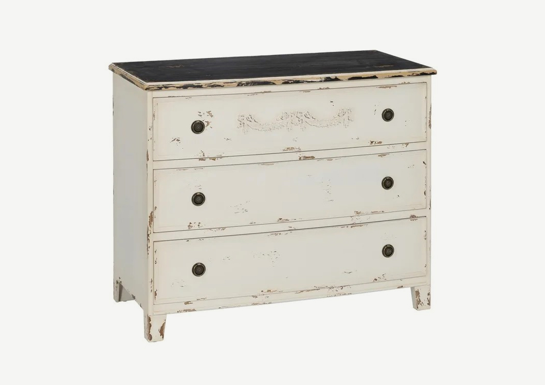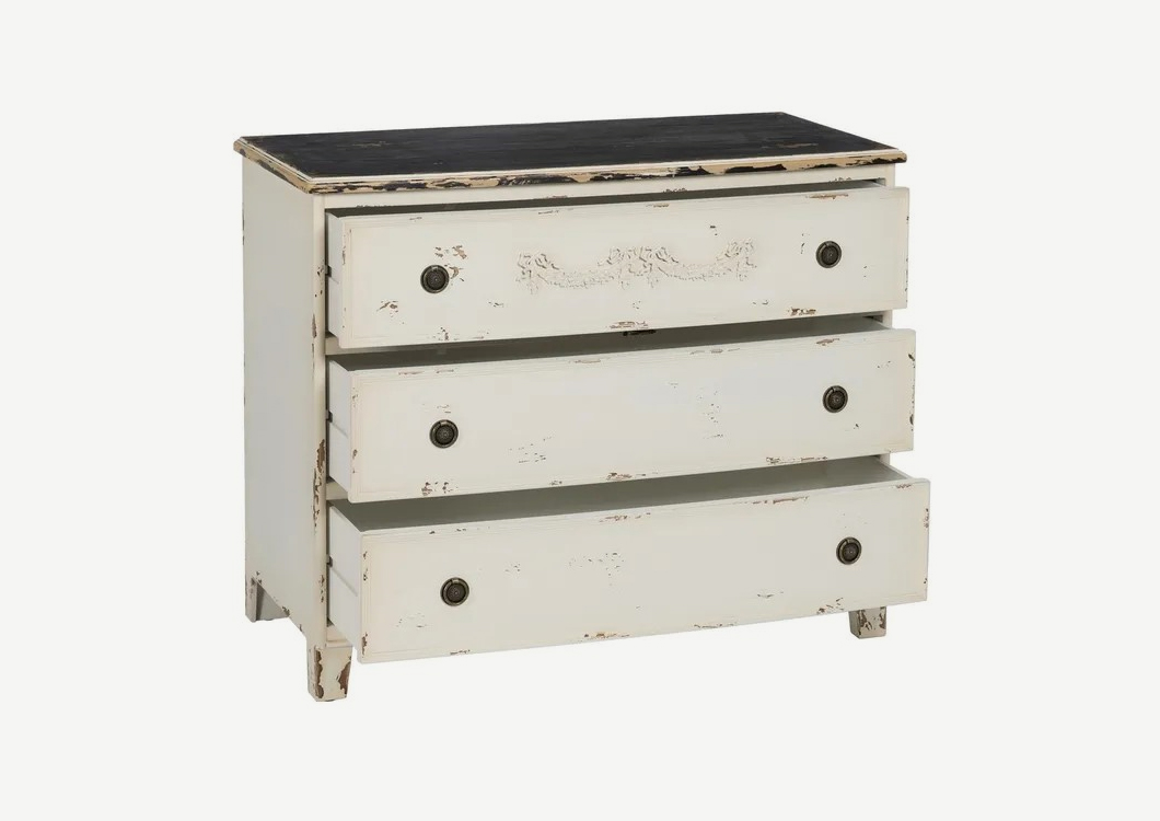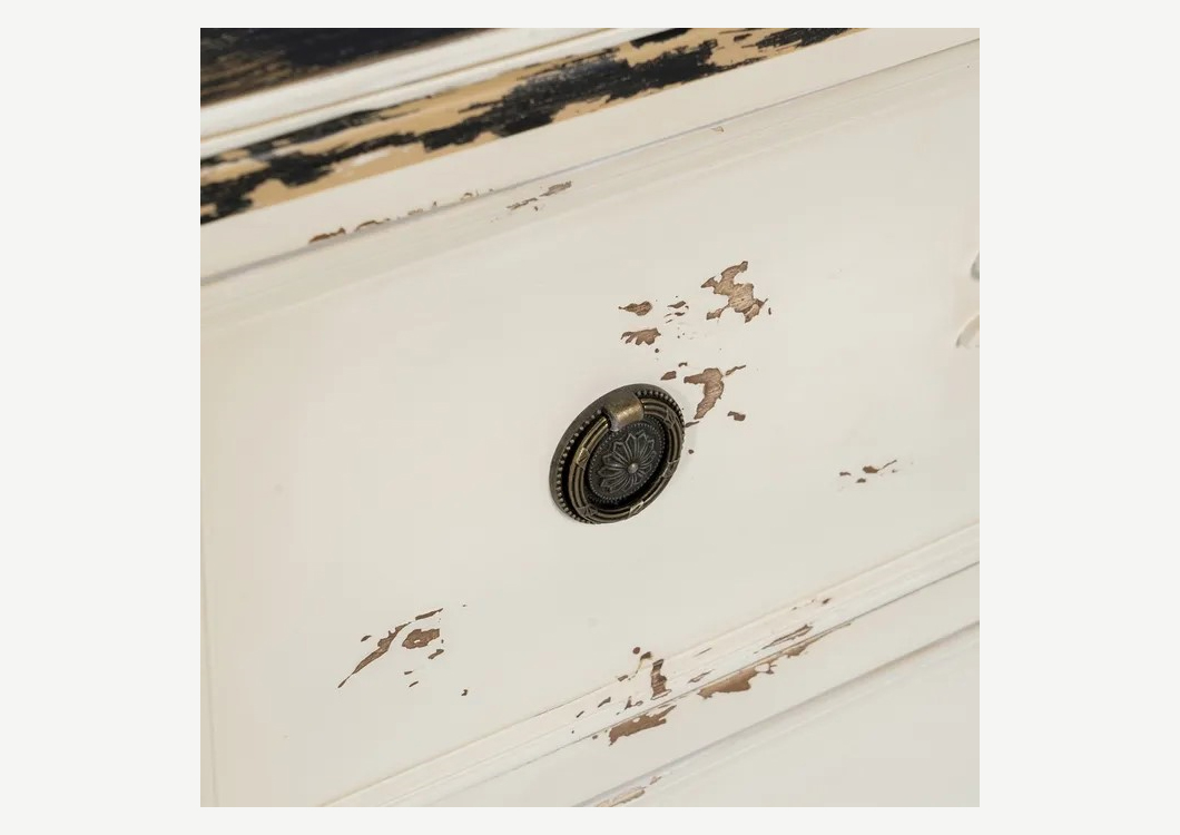 Cómoda 3 cajones, acabado madera blanca rozado, con tiradores de metal